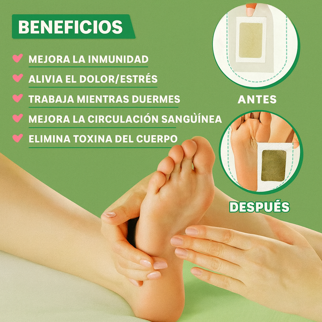 1️⃣ Limpiá y secá el pie · 2️⃣ Pegá el parche · 3️⃣ Dormí 8–10 h · 4️⃣ Retirá al despertar