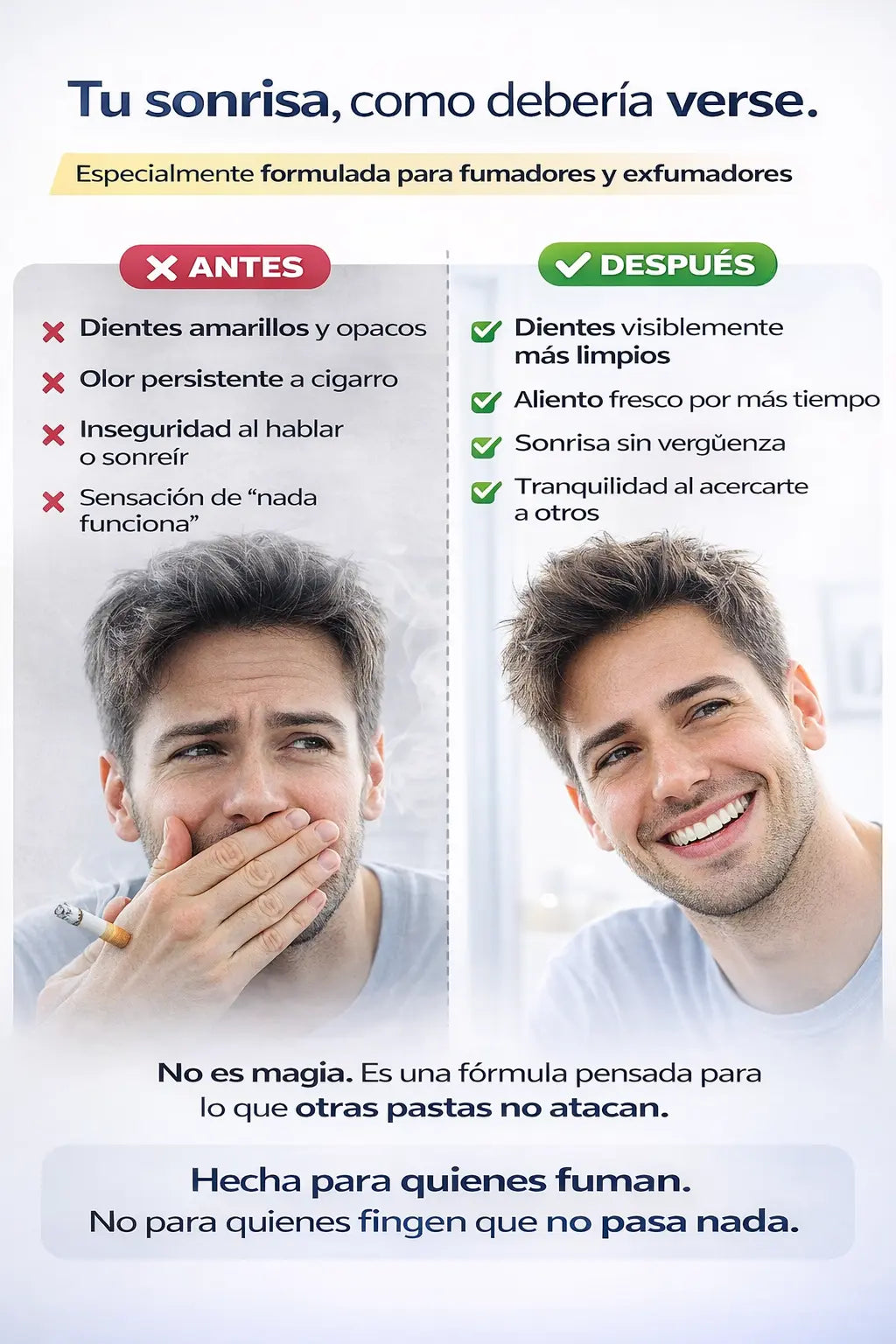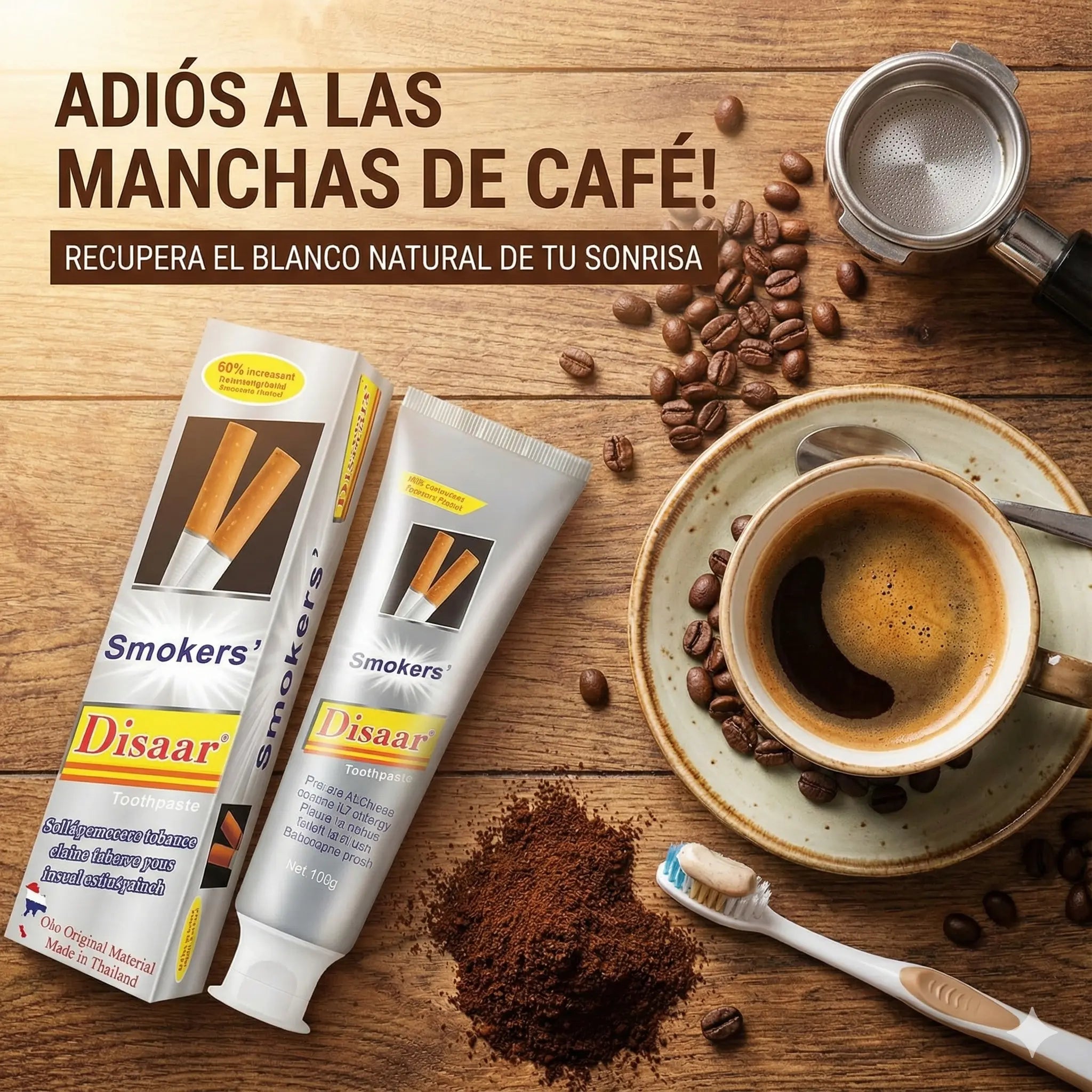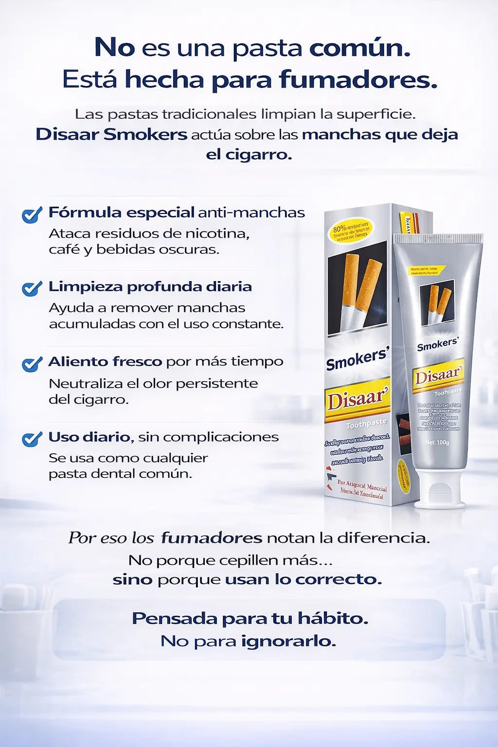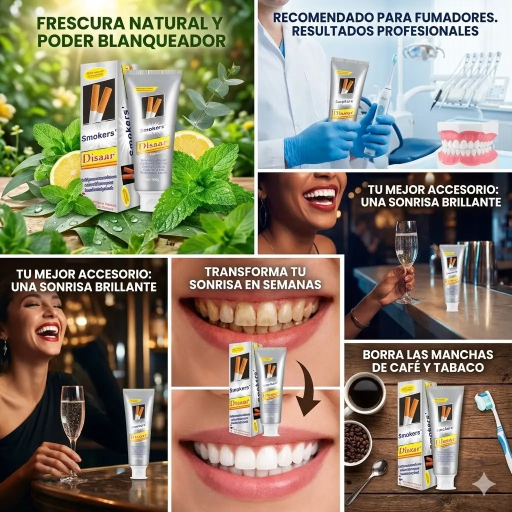La pasta dental Smoker’s Disaar elimina manchas de tabaco, nicotina y café sin dañar el esmalte, mientras refresca el aliento desde el primer uso.